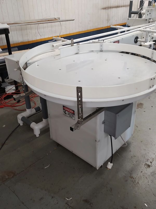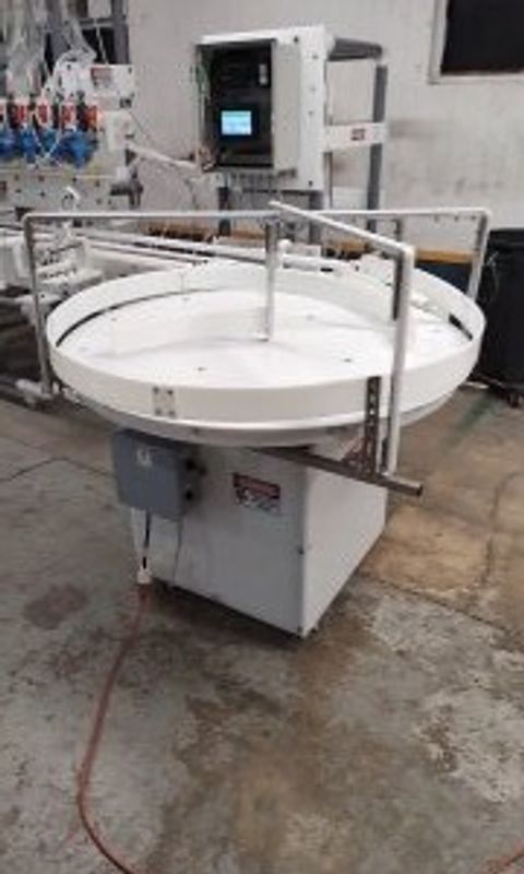 This picture shows a stainless table to feed a feed turntable. The table is workspace to hold a box or bottles increasing operator and production efficiency, The system is feeding a bottle filling machine and line.